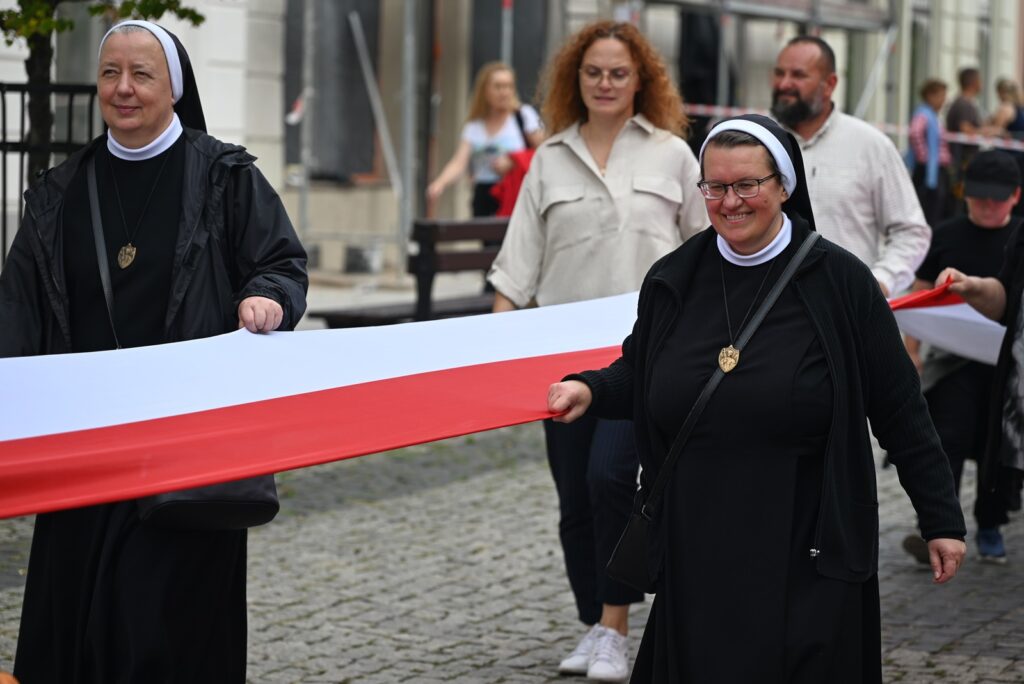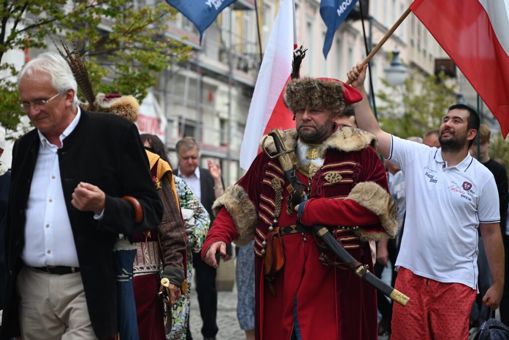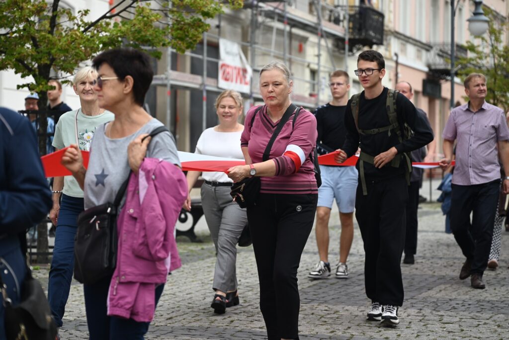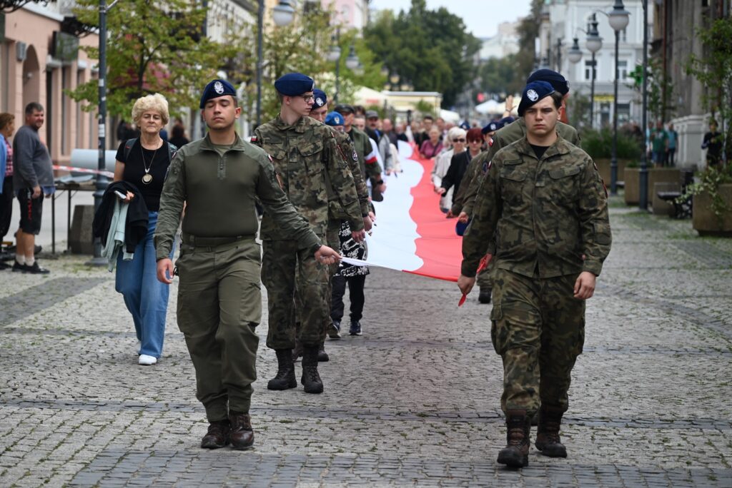 O 13:00 ruszył marsz z Placu Corazziego na Rynek – na czele Orkiestra Reprezentacyjna Wojsk Obrony Terytorialnej, za nią postać Króla z Drużyna Grodu Piotrówka, baner marszu, historyczne i regionalne flagi, sztandary, grupy rekonstrukcyjne oraz… 100-metrowa biało-czerwona flaga, niesiona przez mieszkańców! ![]()