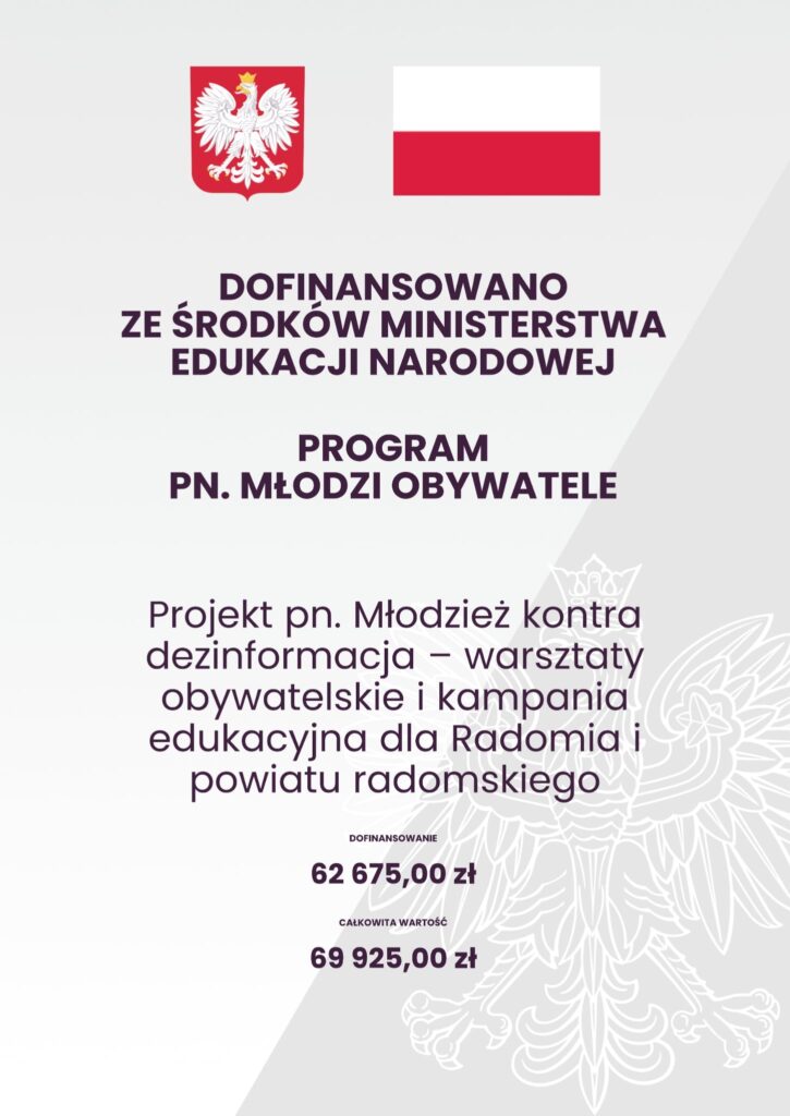 Projekt „Młodzież kontra dezinformacja – warsztaty obywatelskie i kampania edukacyjna dla Radomia i powiatu radomskiego” to kompleksowy program edukacyjny skierowany do młodzieży szkół średnich z Radomia i regionu radomskiego. Jego celem jest wzmacnianie kompetencji medialnych, rozwijanie odporności informacyjnej oraz przygotowanie młodych ludzi do świadomego funkcjonowania w przestrzeni cyfrowej.